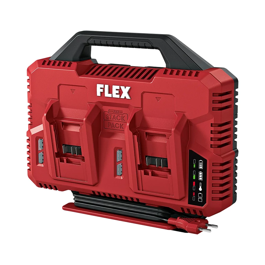 A gyorstöltőben két akkumulátor számára van hely. 2 x 150 W biztosítja a 12 és 18 V-os akkumulátorok gyors és egyidejű töltését. LED-es töltöttségi szint jelzővel, integrált akkumulátor hűtéssel, túlmelegedés, lemerülés és túlterhelés elleni védelemmel. Burkolaton lévő kábelcsévélővel és falra szerelhetőséggel. A gyorstöltő kompatibilis a FLEX STACK PACK tároló- és szállítórendszerrel, és a dobozok/rendszerezők fedelére szerelhető. 18 V akkumulátor töltési idő: 2,5 Ah / 40 perc, 5,0 Ah / 60 perc, 8,0 Ah / 95 perc.